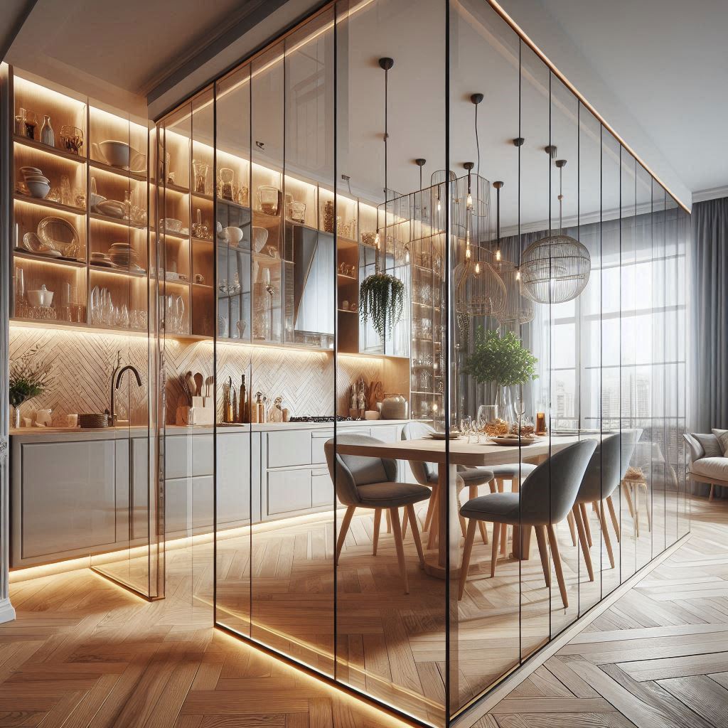 - Одной из ключевых особенностей стеклянных перегородок является их способность делить помещение на зоны, не создавая ощущения замкнутости. Они пропускают свет, что делает пространство более светлым и визуально просторным. Это особенно актуально для городских квартир и офисов, где каждый квадратный метр на счету. Стекло, использованное в таких конструкциях, может быть прозрачным, матовым или тонированным, что позволяет варьировать степень приватности. В зависимости от дизайна и предпочтений, можно выбрать перегородки с полностью прозрачными секциями для максимального эффекта открытости или матовые поверхности, которые придают уединение, сохраняя при этом визуальную легкость.